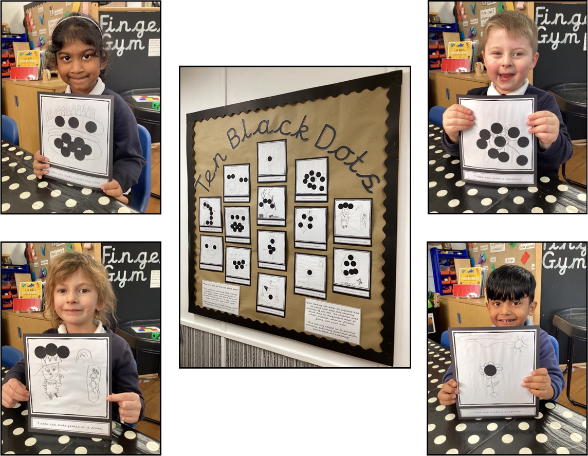 This week in our maths lessons, we have been exploring the book ‘Ten Black Dots’ to help us develop our counting skills. Each page shows how black dots can become something new; a sun, wheels, seeds, balloons, and much more!