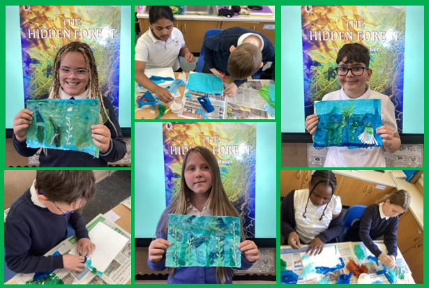 In English , we launched into an exciting new writing topic inspired by The Hidden Forest by Jeannie Baker. The children enjoyed exploring the beautiful illustrations and discussing how the artwork tells a story without using words. Inspired by the book, we had a go at creating our own kelp forest collages. Using a wide range of paper materials, fabrics, cellophane and glitter, the children worked creatively to build layered underwater scenes. To add an extra magical touch, we mixed shimmer paint into PVA glue, which gave our artwork a wonderfully glossy, ocean-like finish.